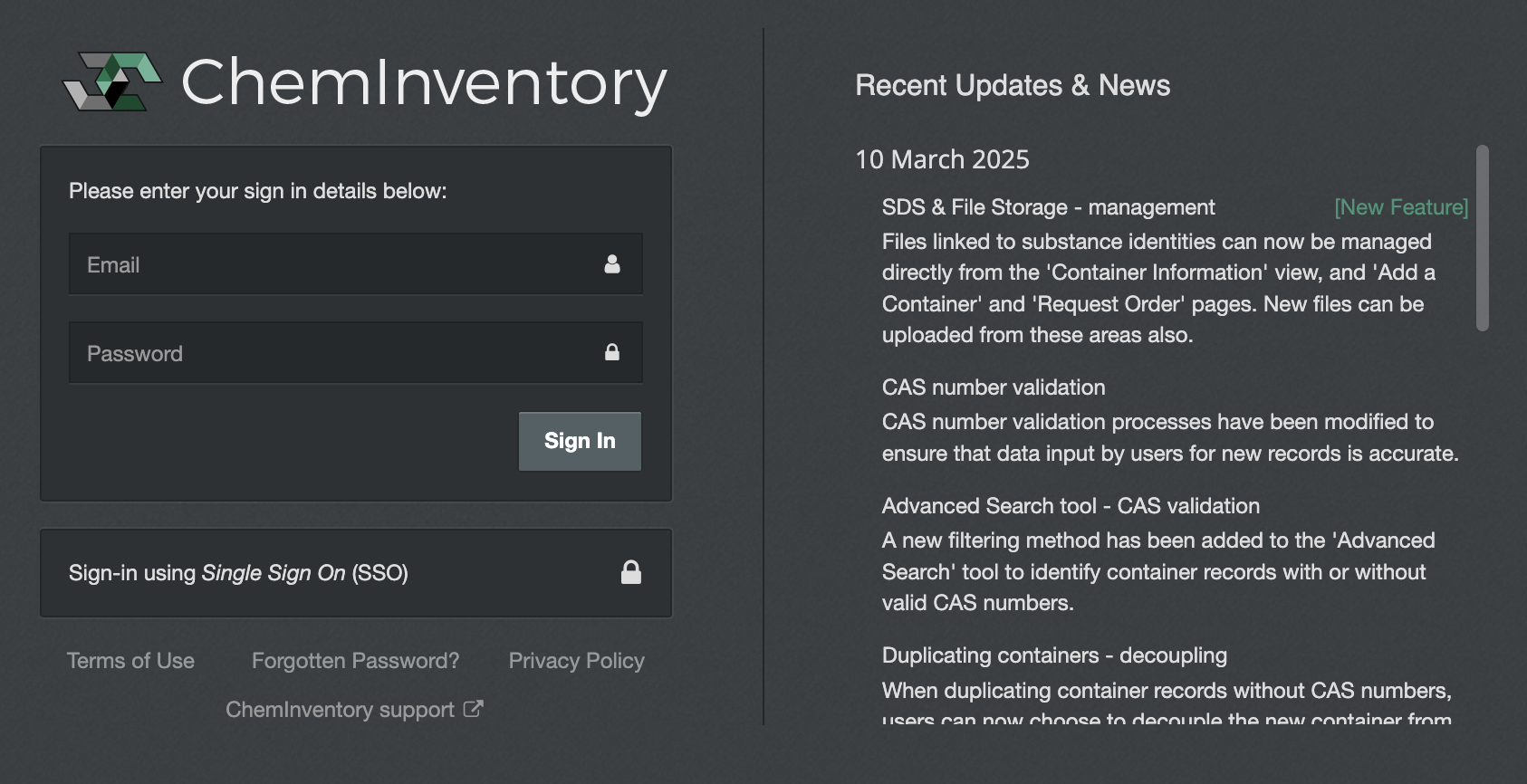 By default, ChemInventory is configured for users to sign into the system using the email address linked to their account, and a password. These details are entered on the sign in page.